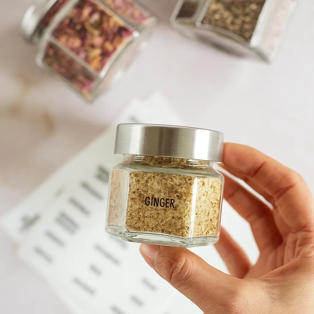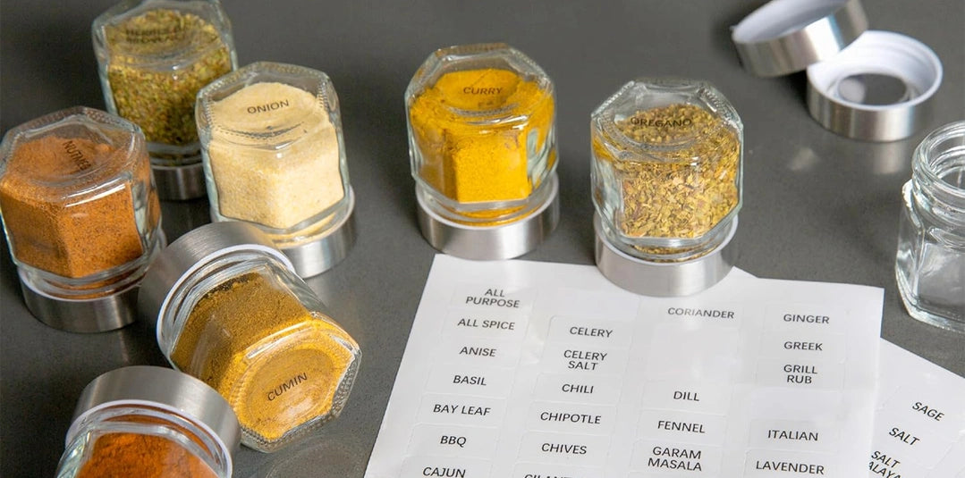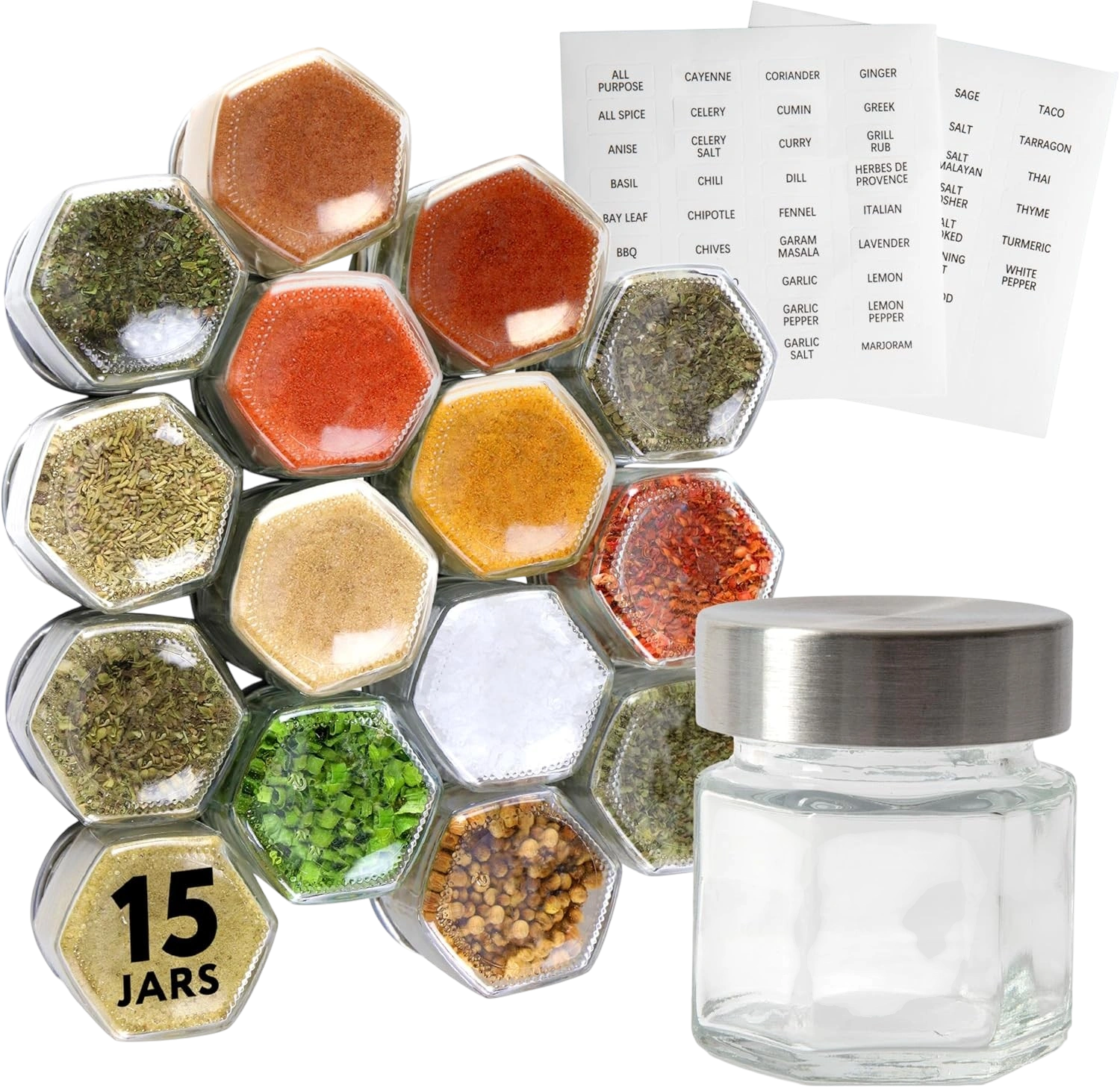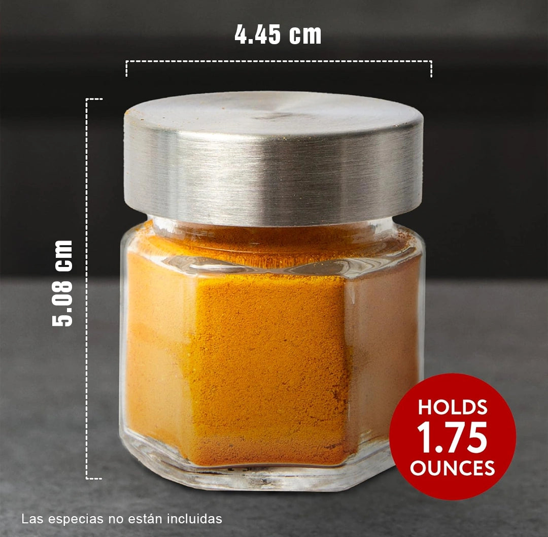 Cada tarro es transparente, resistente y viene con tapa metálica magnética. Trae 60 etiquetas preimpresas con los nombres de las especias más comunes, así que no hay forma de confundirse. Formá tu propio panal de sabor, y usalos también para tés, yerbas, semillas, incluso manualidades.