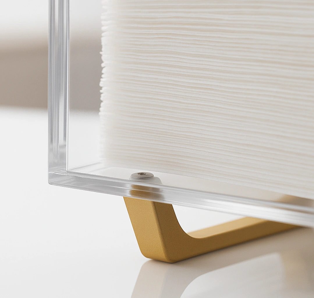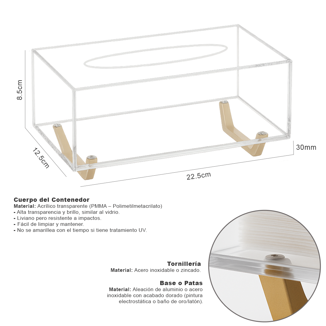 Fabricado con materiales premium como acrílico de alta transparencia y patas metálicas doradas, este contenedor no es solo un accesorio: es una pieza decorativa. Ideal para hogares, oficinas, baños o habitaciones, brinda estilo y organización con un solo producto.