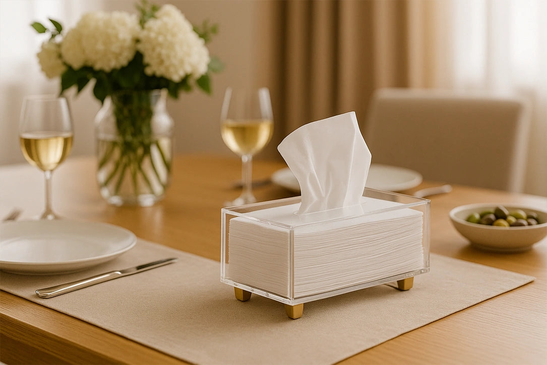 Convierte este pañuelero en el toque distintivo de tu comedor. Úsalo para mantener servilletas organizadas durante comidas familiares, cenas con invitados o celebraciones especiales. Gracias a su diseño transparente y moderno con base dorada, se integra perfectamente como parte de la decoración mientras mantiene la mesa limpia y ordenada. Es ideal tanto para uso diario como para ocasiones especiales.