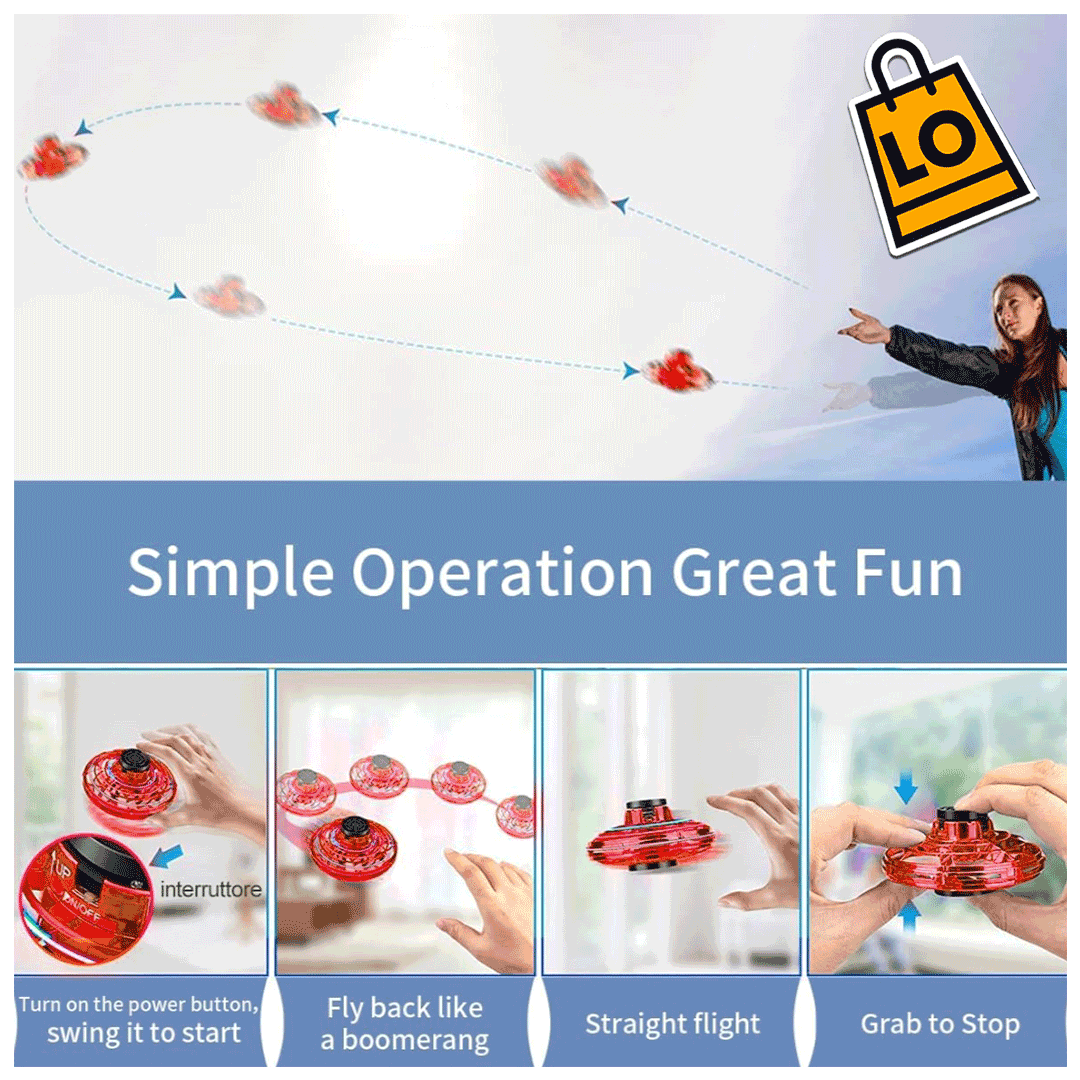 Descubre el Juguete Volador Giratorio con Luces LED que regresa como un bumerán.